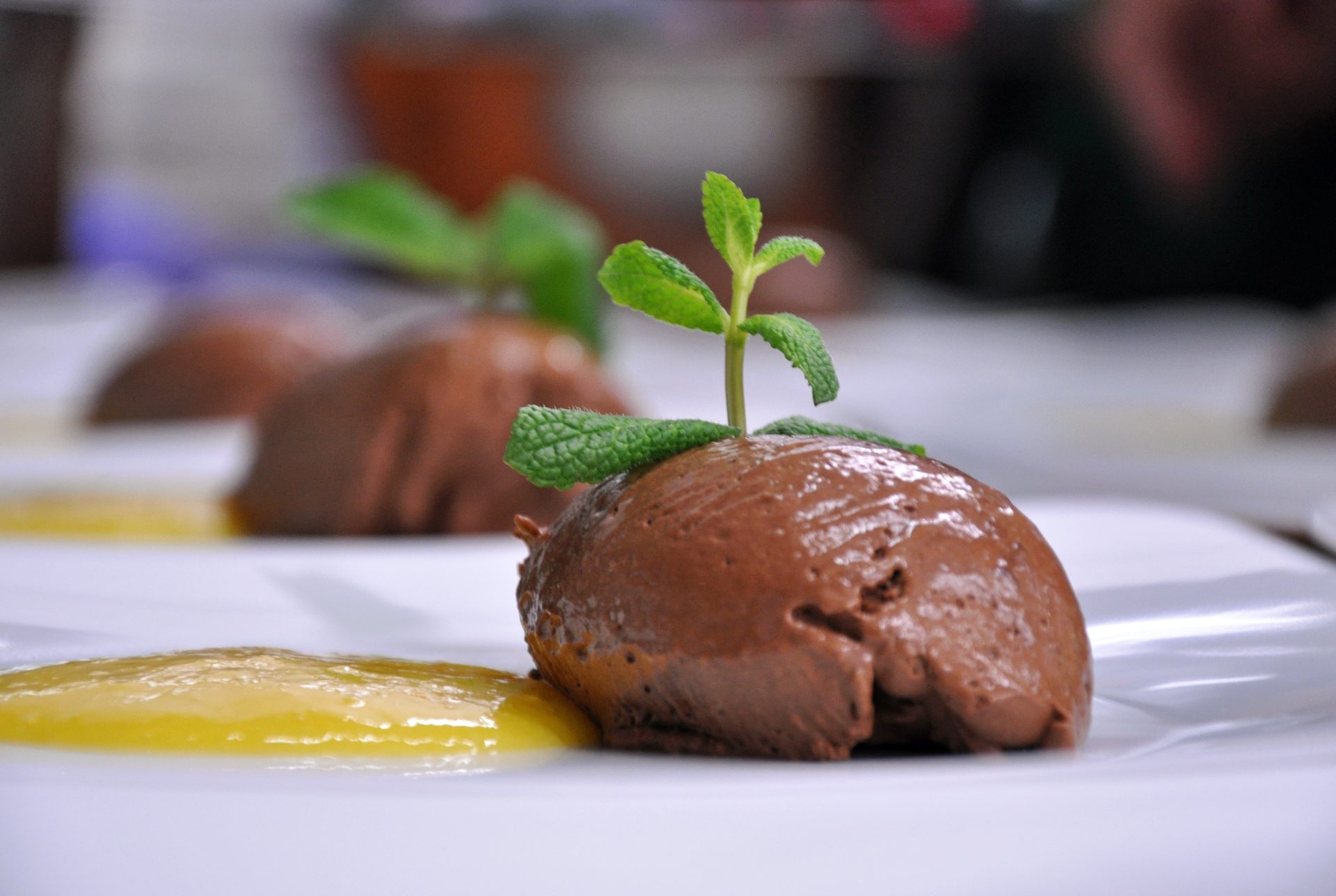 Mousse mit Esslöffel zu Nocken formen, mit Mangopüree auf Teller anrichten und mit frischer Minze garnieren.